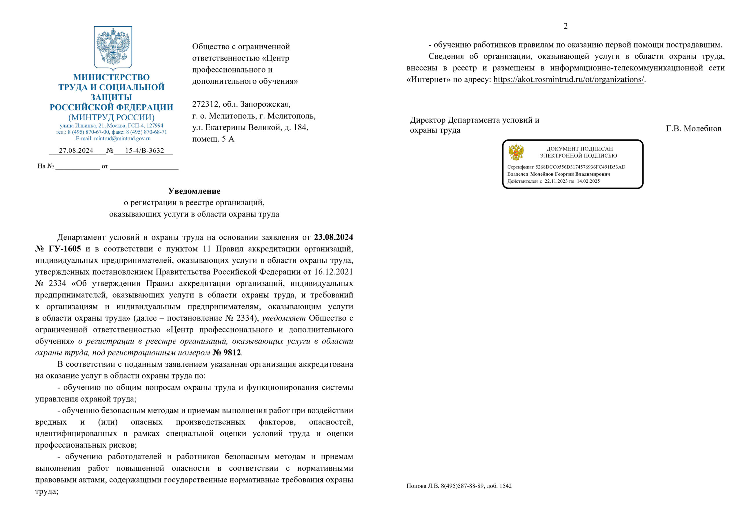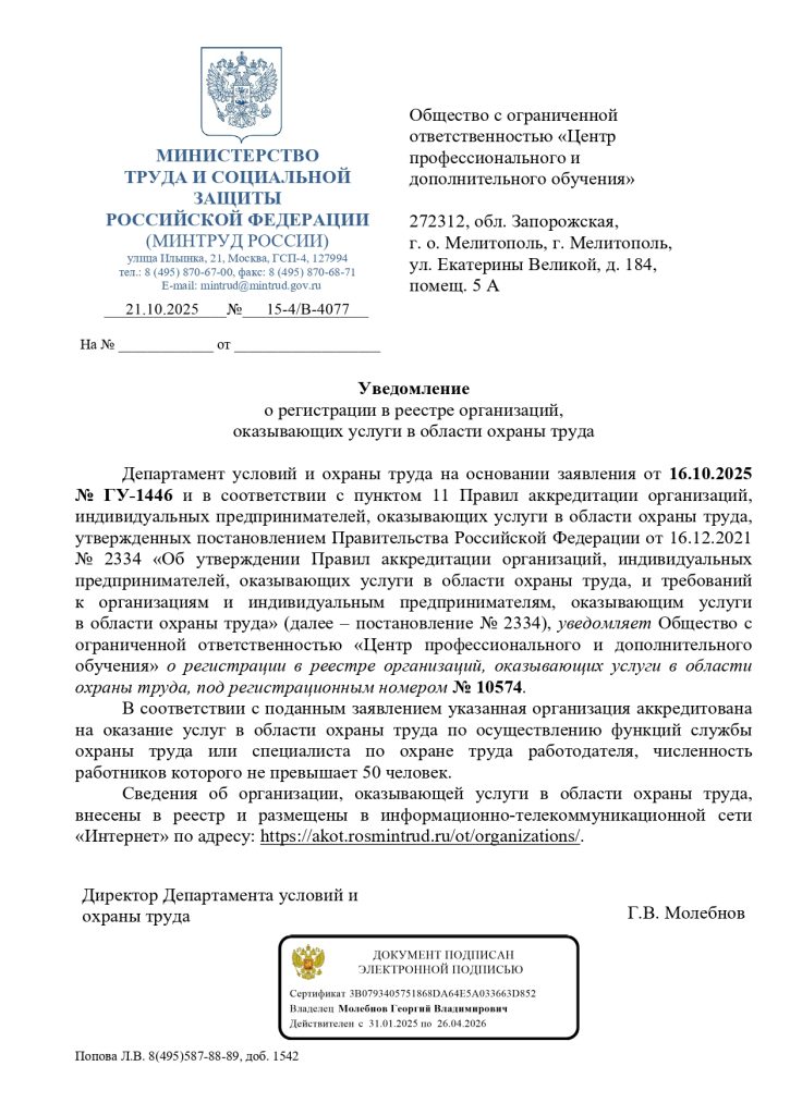 Уведомление о регистрации в реестре организаций, оказывающих услуги в области охраны труда, осуществлению функций службы